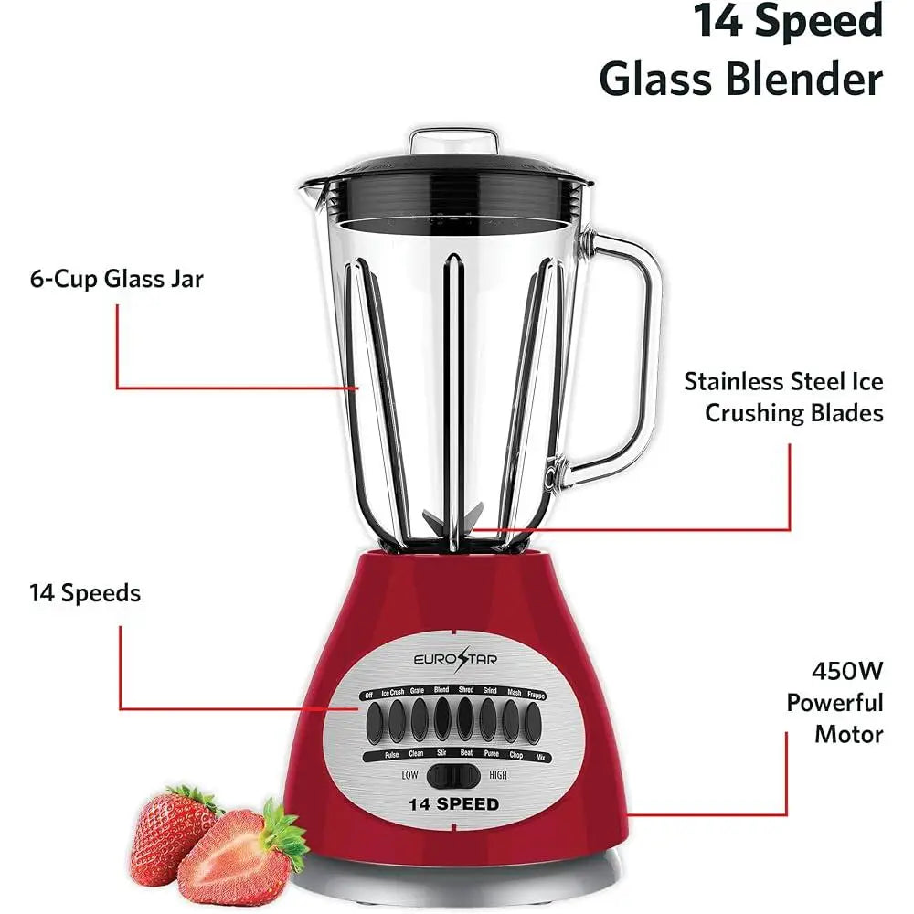 450W Peak Power Blender 14-Speed Glass Jar Smoothie Maker Ice Crushing Stainless Steel Blades Easy Clean Dishwasher Safe
